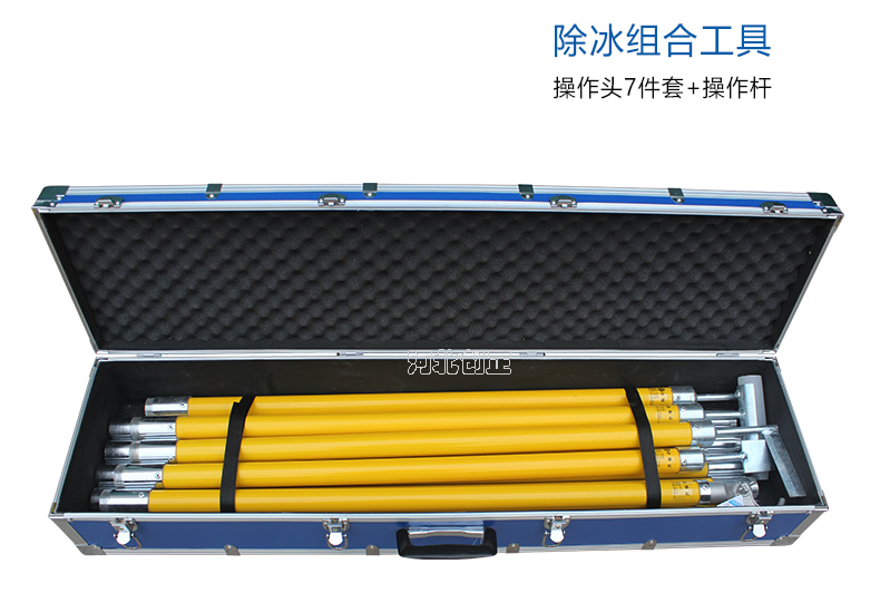 除冰組合工具由絕緣桿和不同的操作頭組成,通過敲、鏟、鉤等方式除去瓷瓶、支架、導線及桿塔上的積雪及覆冰。除冰作業(yè)時,選取操作頭,安裝到絕緣桿的一端并擰緊后使用。絕緣桿分為長、短規(guī)格,根據(jù)現(xiàn)場實際情況進行組合。