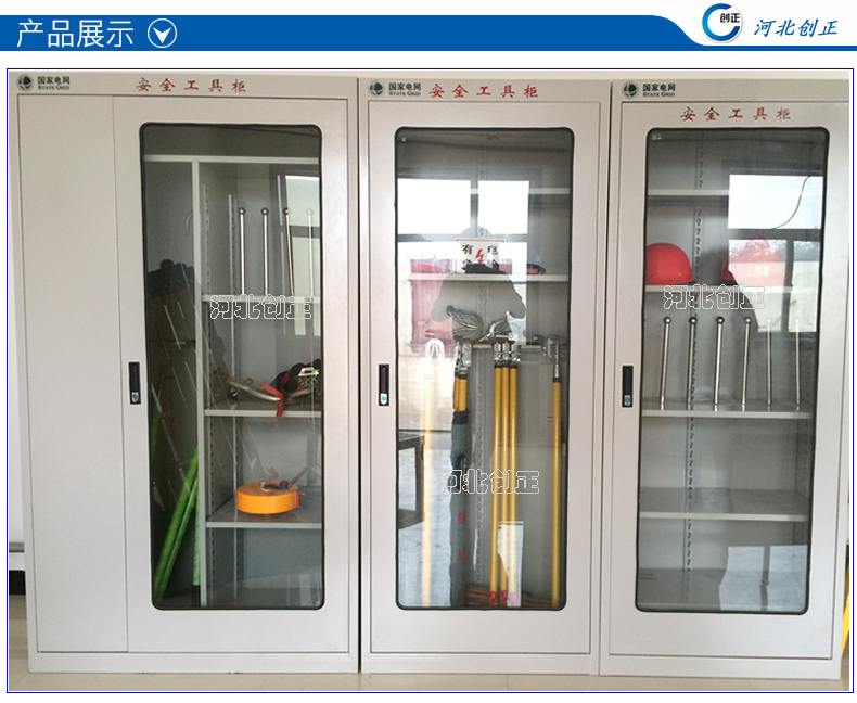 1、柜體是冷軋鋼板卷壓成型,厚度有1.0mm1.2mm1.5mm供選擇。柜體表面采用靜電防腐噴塑工藝,顏色為駝灰色,柜門裝有通體透明鋼化玻璃,透過玻璃可以看到分類有序的工器具。