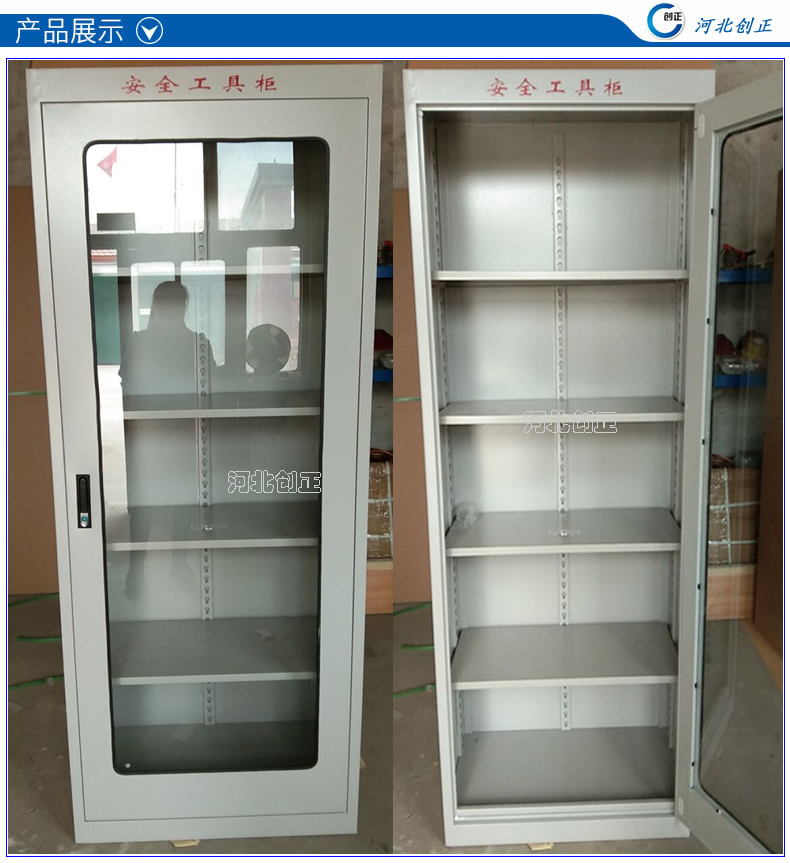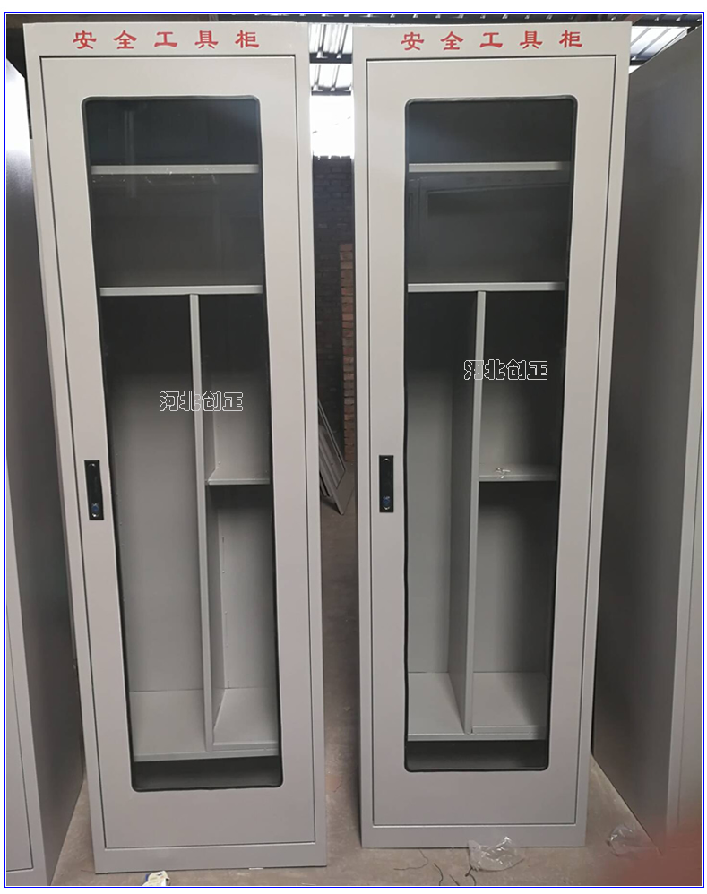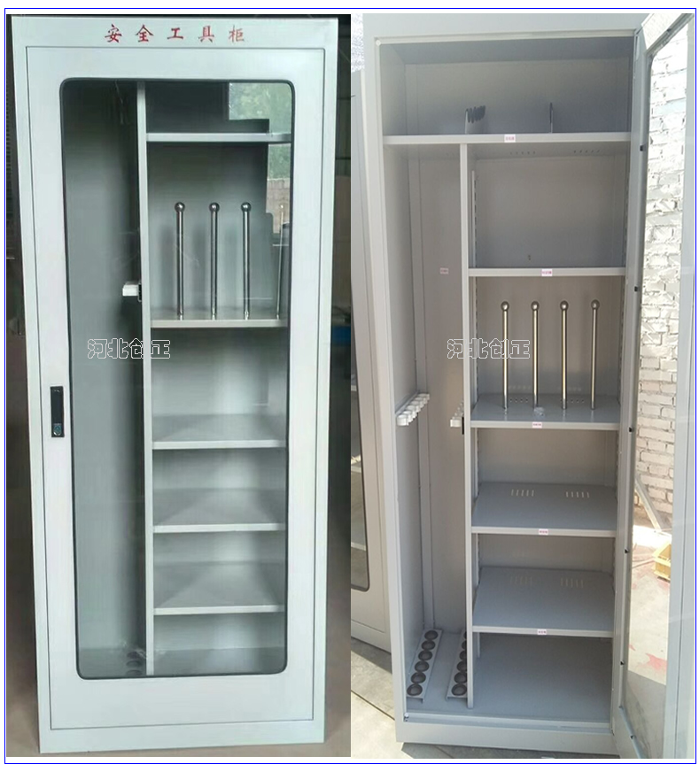 1、柜體是冷軋鋼板卷壓成型,厚度有1.0mm,1.2mm,1.5mm供選擇。柜體表面采用靜電防腐噴塑工藝,顏色為駝灰色,柜門裝有通體透明鋼化玻璃,透過玻璃可以看到分類有序的工器具。